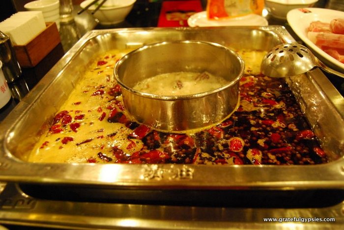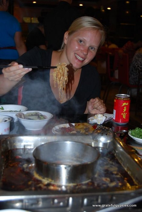 Back in the city, we went out to try the numb and spicy sensation of Sichuan hot pot. The center of our table featured a huge pot full of oil, spices, and Sichuan chili peppers.